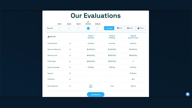 در این پراپ فرم امکان ثبتنام مستقیم وجود ندارد و معاملهگر باید ابتدا پلن مورد نظر را از سایت انتخاب نموده و پس از آن توسط سایت نام کاربری و رمز عبور برای معاملهگر ارسال میشود. برای انتخاب پلن وارد سایت رسمی پراپ فرم بلو گاردین به آدرس WWW.BLUEGUARDIAN.COM وارد شده و مطابق تصویر در بخش Our Evaluation روی گزینه Get Started کلیک کنید.