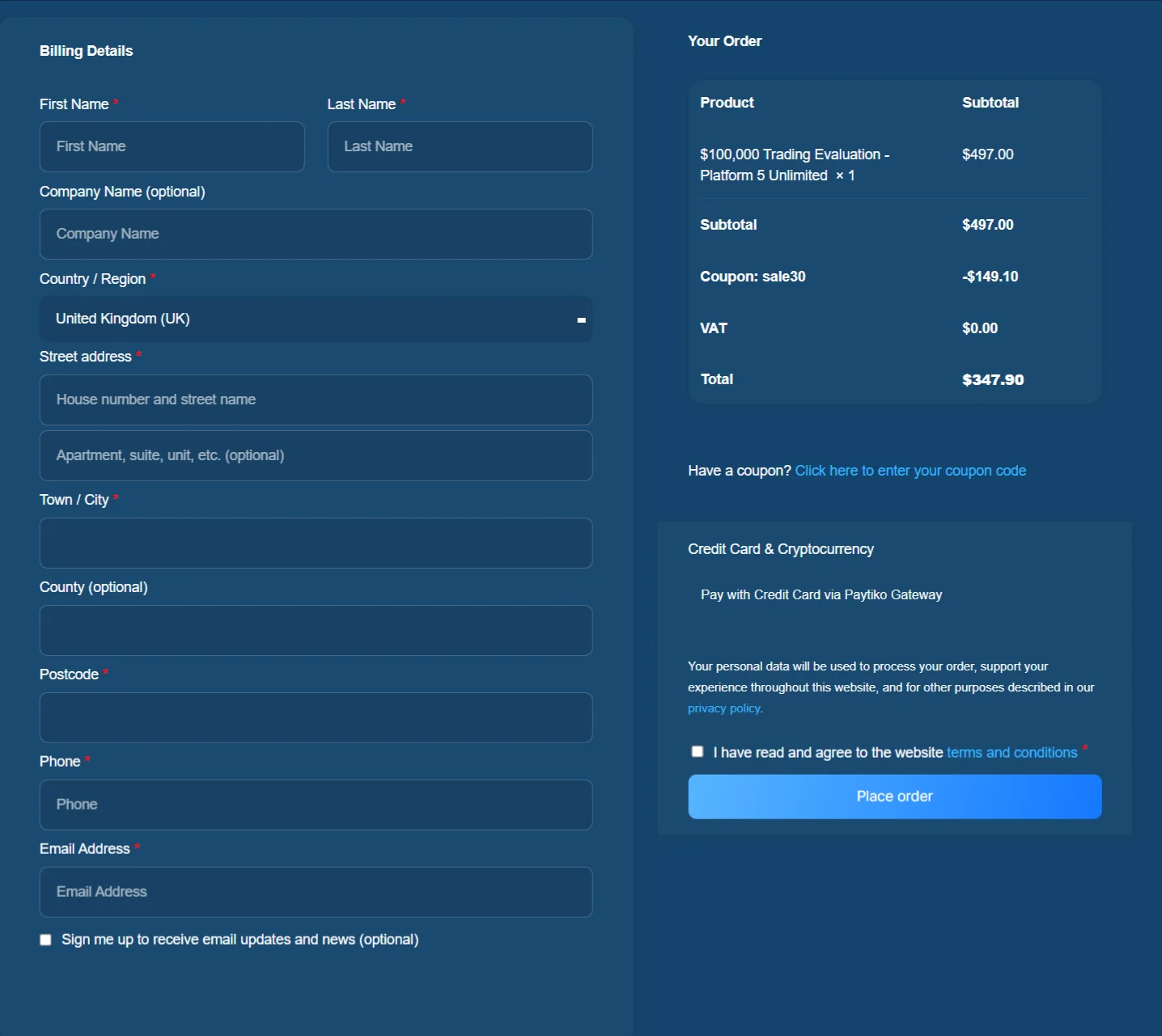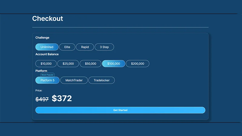 در مرحله بعد به صفحه بررسی پلن انتخابی خود هدایت شده که میتوانید نوع چالش و میزان شارژ حساب و پلتفرم معاملاتی خود را مطابق تصویر انتخاب کنید و روی Get Started کلیک کنید.