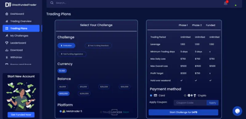 شرکت Direct Funded Trader با ارائه ۳ طرح معاملاتی مختلف به معاملهگران یک فرصت برای داشتن سرمایه کافی به منظور معاملات در بازارهای مالی میدهد. در طرح اول یعنی پلن ارزیابی که دارای ۲ مرحله چالش است. معاملهگر با رسیدن به سود هدف به ترتیب در مراحل اول و دوم ۸% و ۵% و رعایت قوانین حد ضرر روزانه، کلی همچنین حداقل داشتن ۵ روز معاملاتی میتواند به حساب تأمین سرمایه دست پیدا کند. در پلنهای Fast funding standard و Fast funding aggressive یک مرحله چالش وجود دارد که سود هدف در این پلنها ۱۰%، حد ضرر روزانه و کلی به ترتیب ۴% و ۷% میباشد. تنها تفاوت بین این دو پلن میزان اهرم معاملاتی (تأمین سرمایه فوری استاندارد ۱:۵۰، تأمین سرمایه پرتلاش ۱:۳۰) و اینکه در حالت استاندارد امکان معامله در آخر هفته نیست اما در پرتلاش این امکان وجود دارد. میزان تقسیم سود در تمام پلنها از ۸۰% تا ۹۰% متغیر است همینطور بازه پرداخت سود در تمام پلنها بار اول یک ماه تقویمی و برای دفعات بعد در دوره ۱۴ روزه این عملیات انجام میشود.
