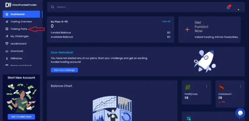 واریز و برداشت در پراپ Direct funded trader به ۲ صورت قابل انجام است. این دو روش شامل ارزهای دیجیتال و پرداخت کارتهای اعتباری بینالمللی میباشد. به منظور انجام عملیات پرداخت ابتدا باید پلن مورد نظر را انتخاب کنید، پس از آن در وبسایت این پراپ فرم ثبتنام کرده و اطلاعات خود را تکمیل نمائید. سپس در پنل کاربری خود روی لینک Trading plans کلیک کنید.