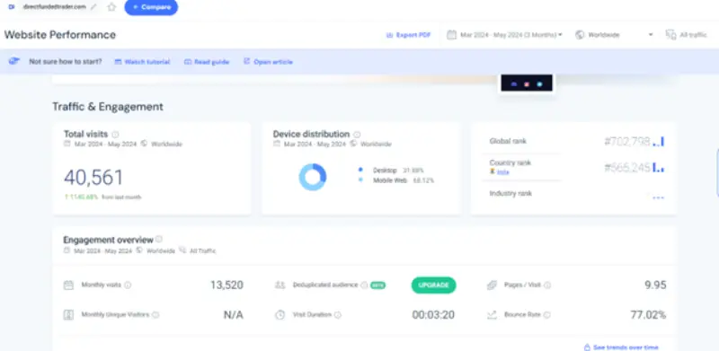در بررسی دیگر از سایت پراپ دایرکت فاندد ترید توسط وبسایت Similarweb که یک پلتفرم تحلیل و آنالیز وبسایت در ابعاد مختلف است. این سایت در بازه ماه مارس تا ماه می سال ۲۰۲۴ توانسته یک رکورد افزایش بازدید حدود ۱۱ برابری نسبت به ماه قبلی خود داشتهباشد. رتبه جهانی این وبسایت ۷۰۲,۷۹۸ بوده که با توجه به سابقه کار کوتاه مدت آن رتبه قابل قبولی میباشد. بررسی نهایی آمار سایت پراپ فرم Direct funded trader یک رشد صعودی را نشان میدهد.