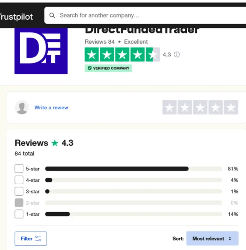 در بخش دیگری از بررسیهای آسان پراپ برابر گزارش وبسایت Trustpilot که یک پلتفرم نقد و بررسی تخخصی وبسایتها میباشد. پراپ فرم Direct funded trader در این نقد و بررسی امتیاز بالا و قابل قبولی را گرفته است. میانگین نمره ۴.۳ نشان رضایت بالای کاربران این وبسایت میدهد.