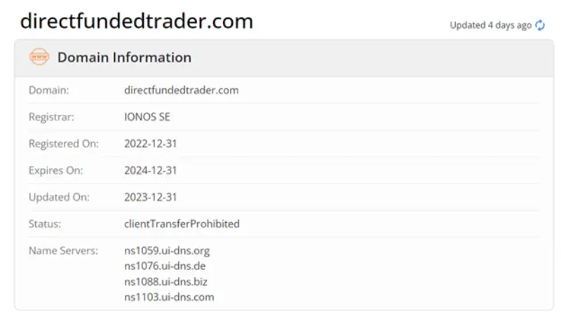 مطابق گزارش ارائه شده توسط سایت whois.com از وبسایت دایرکت فاندد ترید در دسامبر سال ۲۰۲۲ به صورت رسمی ثبت گردیده است.