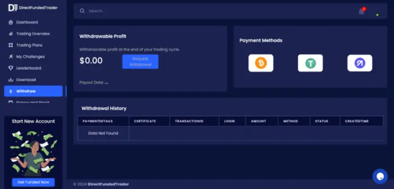 گزینه withdraw را برای برداشت وجه از پراپ فرم دایرکت فاندد تریدر بزنید. - پس از آن صفحه برداشت به شما نمایش داده میشود که در آن میزان سود، متد پرداخت و تاریخچه برداشت سود قابل مشاهده است.