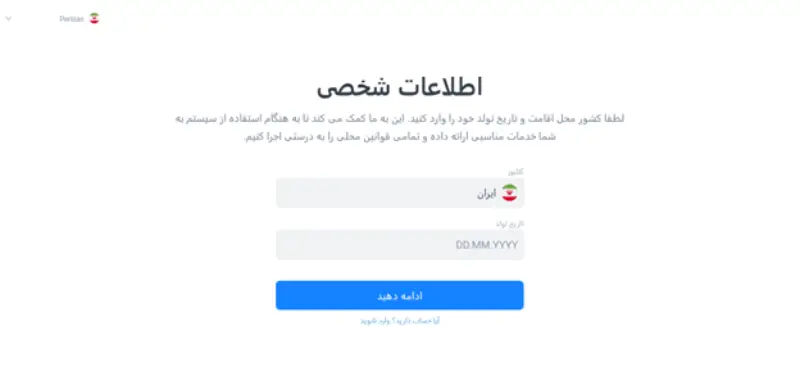 در صفحه بعدی ممکن است زبان سایت مجدد به انگلیسی تغییر پیدا کرده که از قسمت بالا میتوانید زبان را روی فارسی (Persian) تنظیم کنید. در صفحه پیشرو، کشور خود را انتخاب و در بخش بعدی تاریخ تولد خود را به میلادی وارد نمایید.