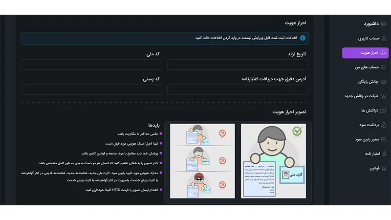 در نظر داشتهباشید در صورتی که مشخصات خود را در ابتدا در داخل پنل کاربری وارد نکرده باشید ابتدا به صفحه پر کردن فرم اطلاعات شخصی هدایت میشوید و پس از تأیید آن صفحه احراز هویت برای شما نمایش داده میشود. به منظور احراز هویت مانند تصویر راهنما باید یک مدرک شناسائی (شناسنامه، کارتملی یا پاسپورت) و یک متن تعهد نامه با امضاء خودتان داشتهباشید و آن را آپلود کنید. سپس منتظر تأیید هویت از طرف کارشناسان رابین سود بمانید. در نظر داشته باشید این پروسه ممکن است تا ۲۴ ساعت زمان ببرد.