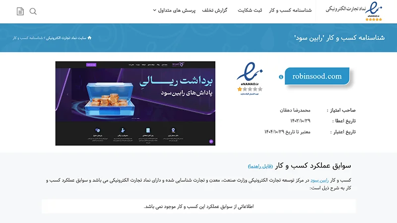 رابین سود از معدود پراپ فرمهای ایرانی هست که توانسته مجوز رسمی کسب و کار خود را از مرکز توسعه تجارت الکترونیک (زیر نظر وزارت صنعت و معدن) دریافت کند. داشتن این مجوز به منزله قانونی بودن این مجموعه در کسب و کار آنلاین است. در تصویر، اطلاعات مربوط به این وبسایت در سایت اینماد مشاهده میفرمائید.